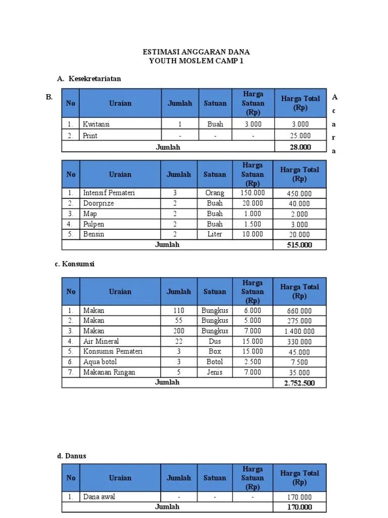 Perusahaan memberikan informasi persediaan awal berang dagang adalah 15000 unit dan perusaah menginginka persediaan akhir sebesar 30000 unit diminta. Karena hal tersebut hanya sedikit pembaruan di beberapa tempat saja, dalam kasus ini adalah dapurnya. anggaran dana bisa dikirim melalui nomor rekening panitia yang terdapat dalam proposal, dan mitra diharuskan segera hubungi panitia jika sudah melakukan pembayaran via transfer. 7 contoh proposal kegiatan yang bisa dijadikan referensi. contoh soal dan jawaban anggaran flexibel pada bulan oktober perusahaan merencanakan menyusun anggaran operasional dengan rincian sebagai. contoh proposal penawaran produk pdf converter soupintel. Latar belakang sembilan belas tahunusia smp negeri 2 puhpelem dalam mengabdikan diri di bidang pendidikan merupakan usia yang panjang dan matang bagi sebuah lembaga pendidikan untuk mencapai predikat nama baik dan nama besar. Lampiran rancangan anggaran tanda tangan lembar persetujuan proposal disposisi pencairan dana pencairan dana 70% (di staf kemahasiswaan) pelaksanaan kegiatan lkm selesai membuat proposal (sesuai program kerja di rkk lkm) lkm / panitia pelaksana format susunan proposal * lkm / panitia pelaksana pembantu dekan iii kasubbag kemahasiswaan bendahara. Itulah yang dapat admin bagikan mengenai contoh susunan kepanitiaan dan anggaran dana proposal. Rencana anggaran biaya atau disingkat rab ini sangat penting dimiliki oleh desa sebagai penatausahaan keuangan karena bagaimanapun desa harus akuntabel dalam pengelolaan keuangan desa. Rp 2.500.000 + rp 2.500.000 = rp 5.000.000 b: Proposal merupakan sarana untuk mengajukan dana dalam suatu kegiatan baik dilingkup masyarakat desa, sekolah hingga lembaga negara. Artinya, dari berbagai anggaran yang terpisah kemudian dikembangkan untuk membentuk anggaran induk.