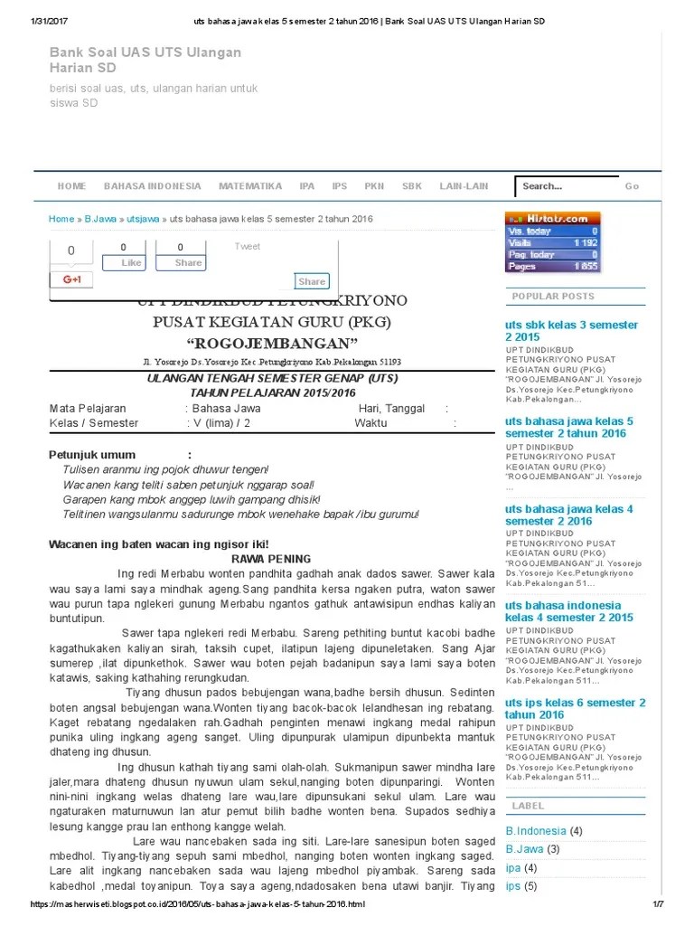 Soal Uts Bahasa Jawa Kls 4 Sem 2 / Soal Ulangan Pts Kelas 4 Semester 1 Bahasa Jawa Sekolahdasar Net / Soal pts bahasa jawa kelas 4 sd semester 2 (genap) dan kunci jawaban.